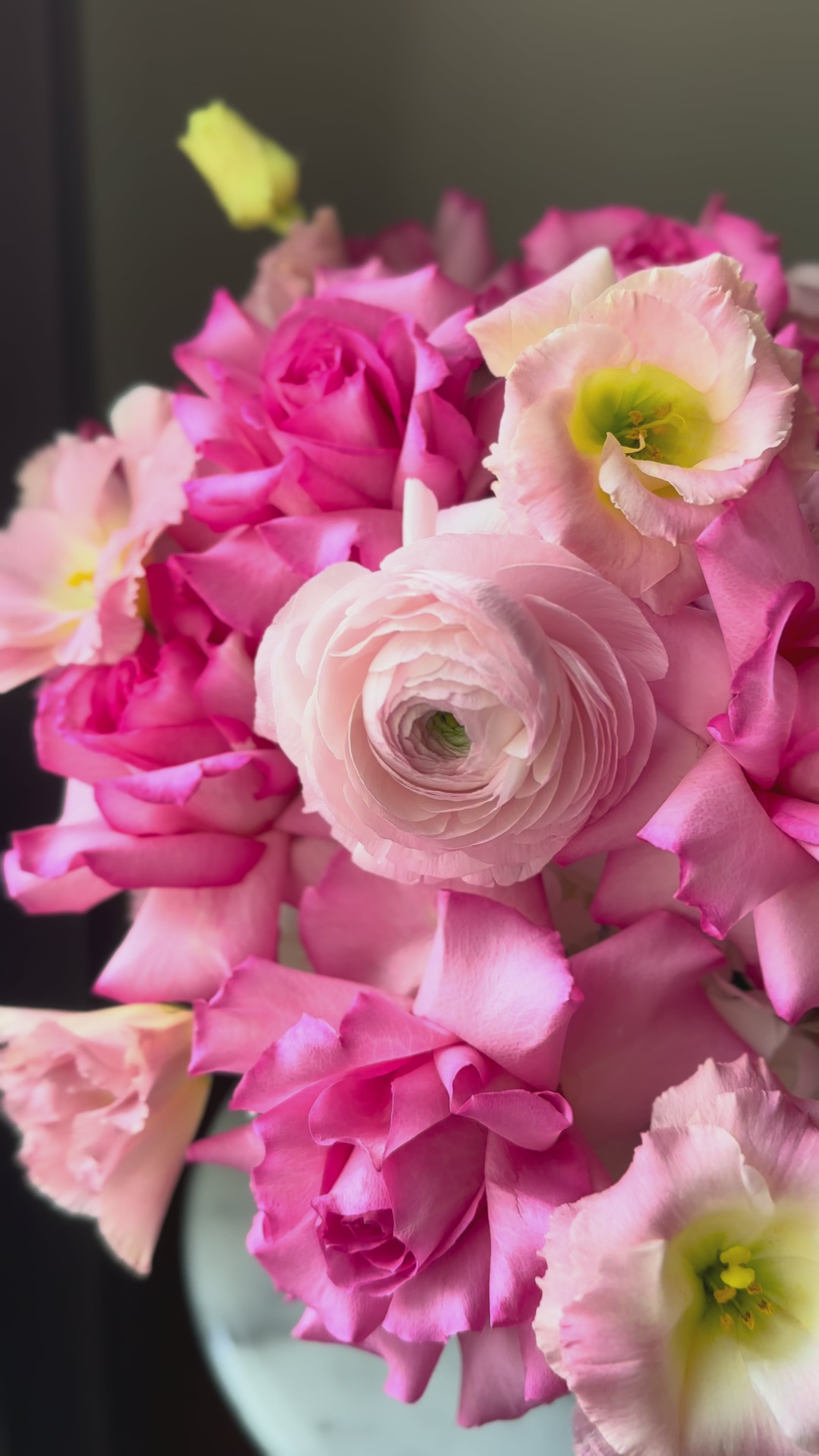 Hot pink roses, rich purple ranunculus, and voluminous hydrangea come together in a vibrant , striking harmony.